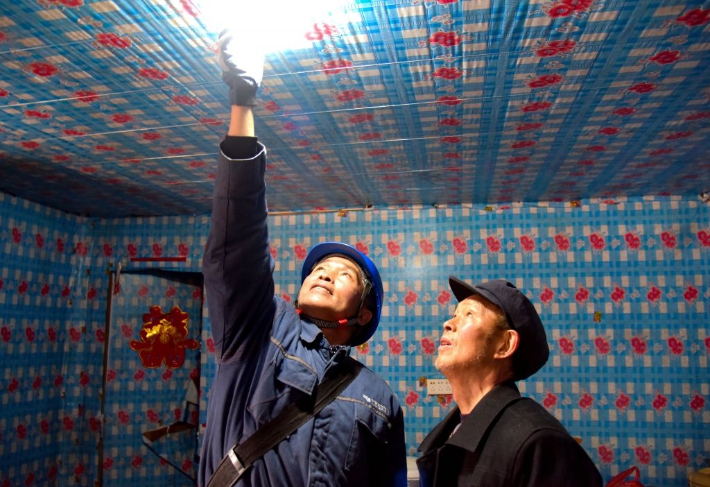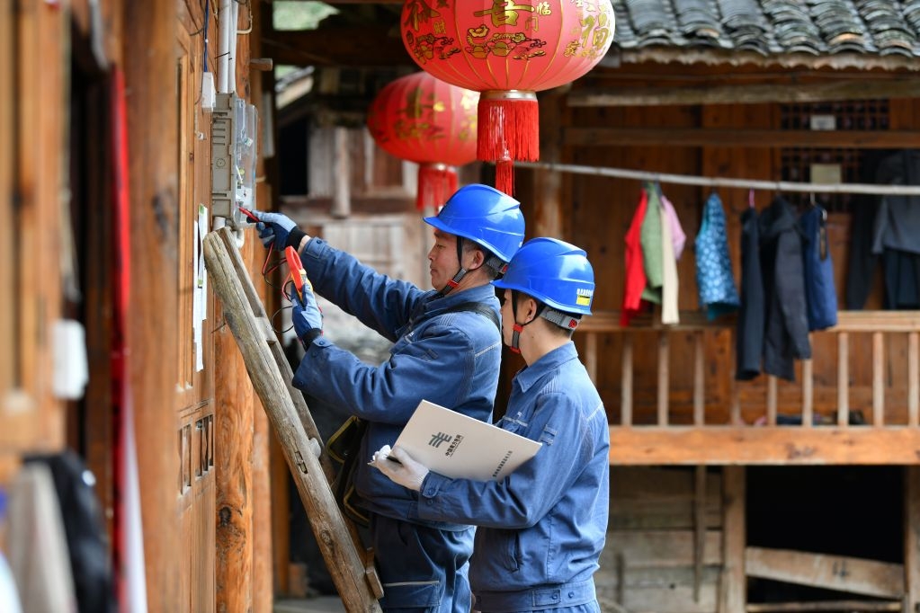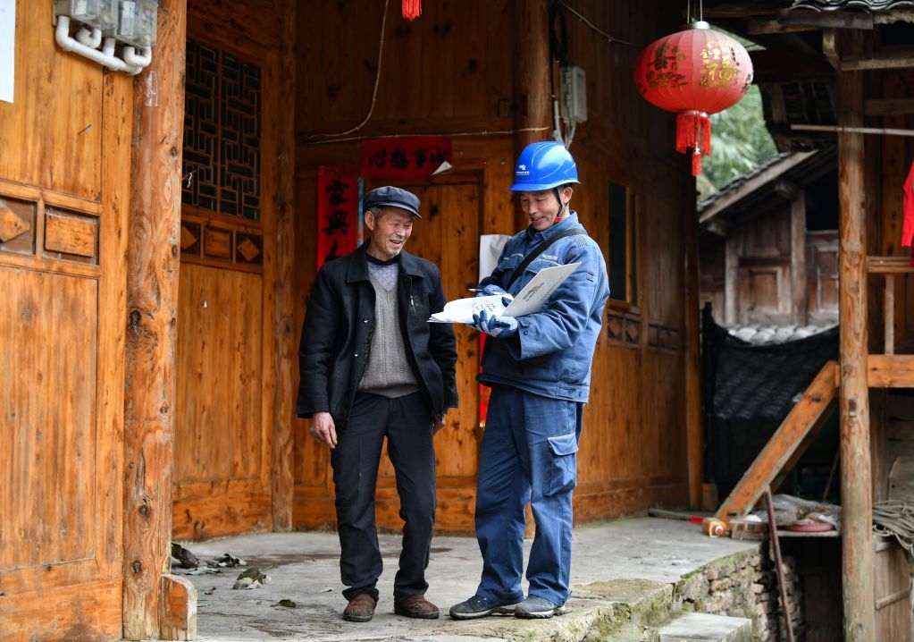 08 地处典型南方喀斯特地貌中的贵州省黔东南苗族侗族自治州施秉县白垛乡白垛村山洞组,是只有8户村民的村组,这里大山环抱四面绝壁,进入村里的通道是一条附在悬崖上的小路,人们称之为人“天坑村”。 2019年,为助力山洞组村民脱贫,走好乡村振兴之路,南方电网公司贵州凯里施秉供电局加大山洞组的电网建设力度,在保障安全的情况下,克服搬运建设物资困难、地质复杂等施工困难,为山洞组增加了一台变压器、架设了一条长达4500余米的配电线路,改变了“天坑村”用电不稳定的现象。 2023年2月24日,南方电网贵州凯里施秉供电局党员服务队走进“天坑村”,了解老人们的生活状况及用电需求,细心检查表计接线及室内外线路运行情况,排查并消除用电隐患,助力“天坑村”村民春耕生产安全可靠用电,用责任与担当默默守护万家灯火。(7/9)