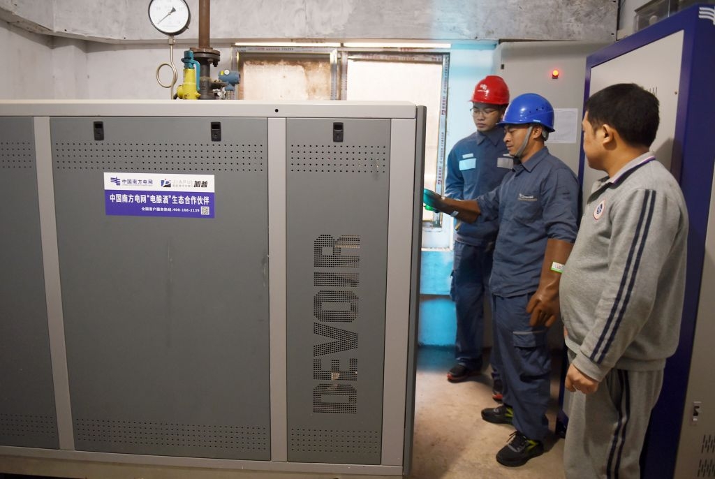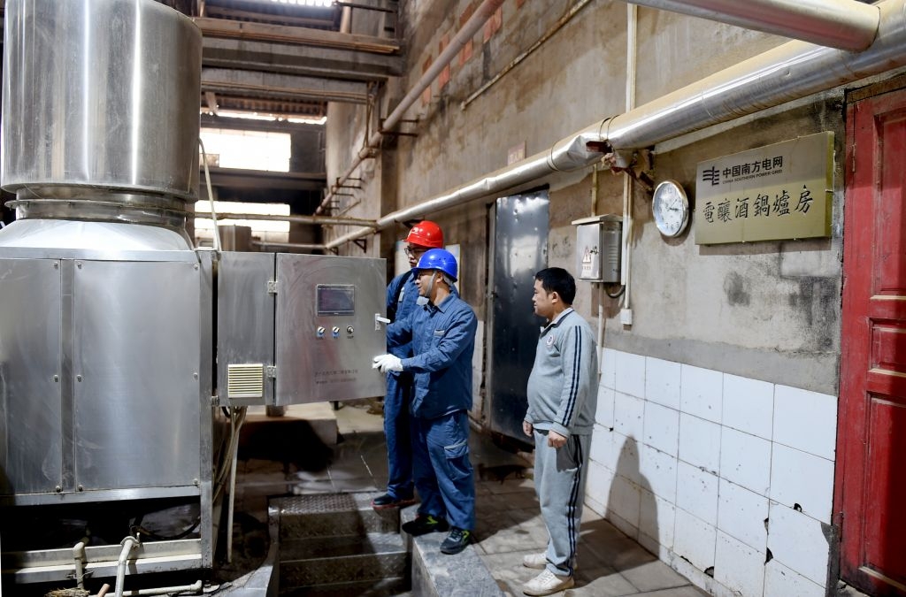 供电员工对“电酿酒”的电锅炉设备进行用电检查。陈举 摄党的二十大报告提出,推动经济社会发展绿色化、低碳化是实现高质量发展的关键环节。 “加快节能降碳先进技术研发和推广应用,倡导绿色消费,推动形成绿色低碳的生产方式和生活方式。”作为中央企业,南方电网贵州电网公司围绕“双碳”目标,主动作为,靠前服务,大力推动能源绿色低碳转型,按照“成熟领域全覆盖、新兴领域大力推、创新领域抓试点”的思路,深度挖掘电能替代项目,积极推进“电酿酒”“电制茶”“电烤烟”“电磁厨房、热泵”等“新电气化”,特别是“电酿酒”“电制茶”具有贵州特色的产业,倡导客户绿色消费,取得了明显的成效,预计2023年实施电能替代电量将不低于50亿千瓦时。(1/8)