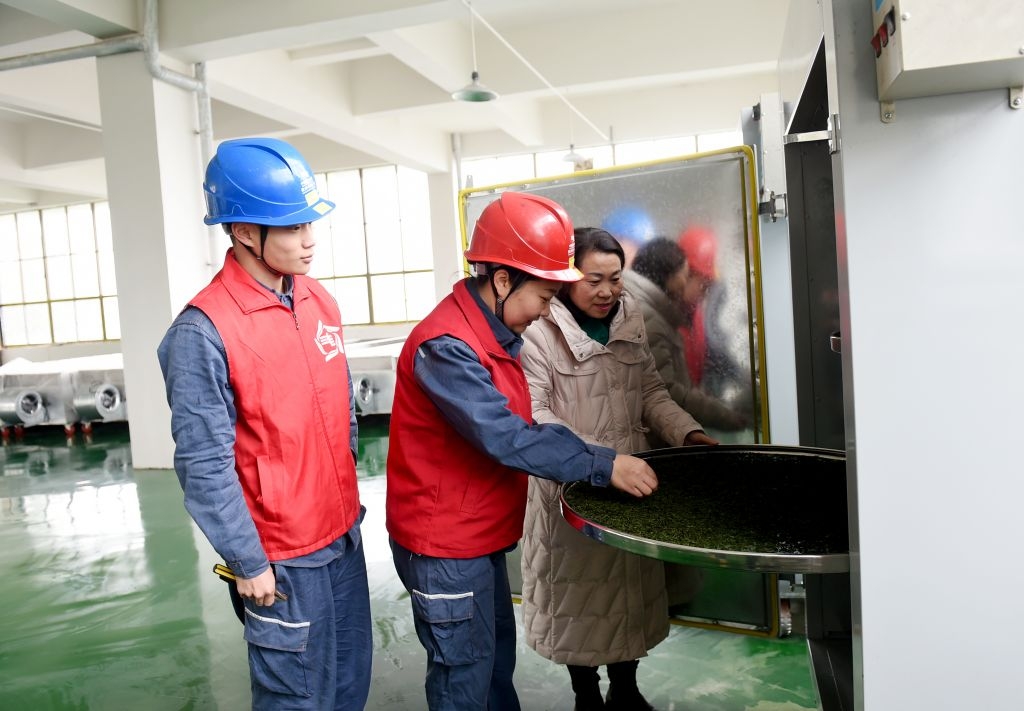 供电员工了解“电制茶”过程中用电情况。陈举 摄党的二十大报告提出,推动经济社会发展绿色化、低碳化是实现高质量发展的关键环节。 “加快节能降碳先进技术研发和推广应用,倡导绿色消费,推动形成绿色低碳的生产方式和生活方式。”作为中央企业,南方电网贵州电网公司围绕“双碳”目标,主动作为,靠前服务,大力推动能源绿色低碳转型,按照“成熟领域全覆盖、新兴领域大力推、创新领域抓试点”的思路,深度挖掘电能替代项目,积极推进“电酿酒”“电制茶”“电烤烟”“电磁厨房、热泵”等“新电气化”,特别是“电酿酒”“电制茶”具有贵州特色的产业,倡导客户绿色消费,取得了明显的成效,预计2023年实施电能替代电量将不低于50亿千瓦时。(5/8)