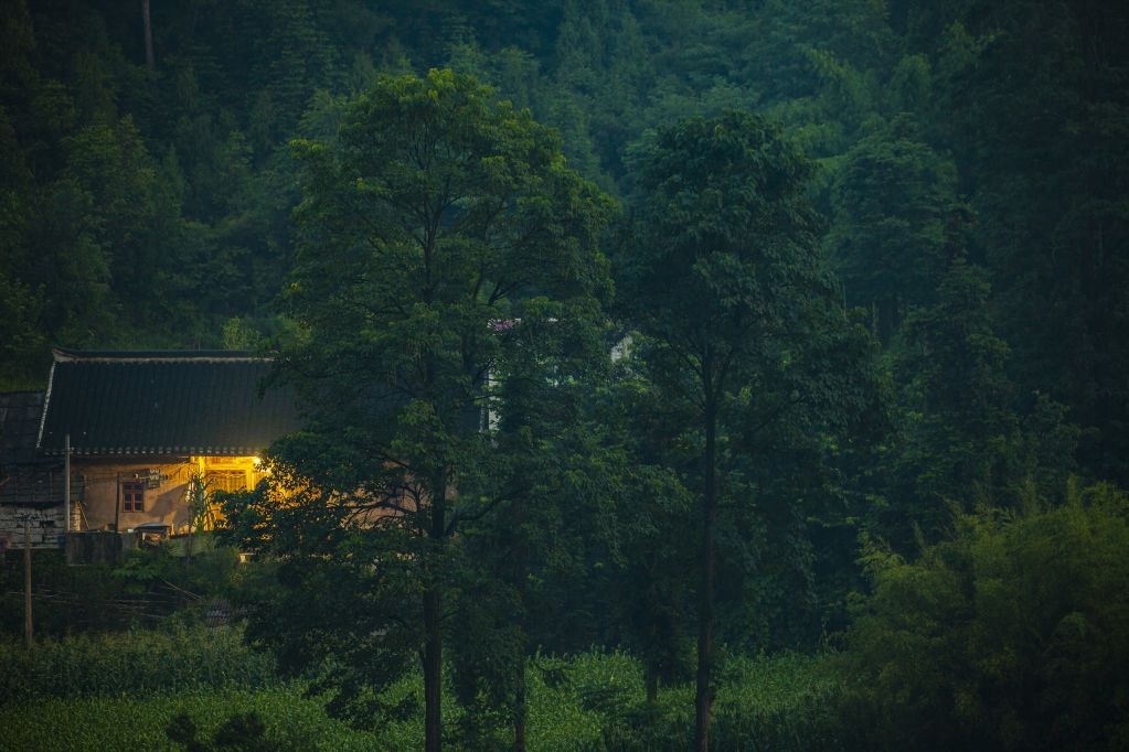 美丽的乡村,傍晚开启的路灯,温暖亮堂。